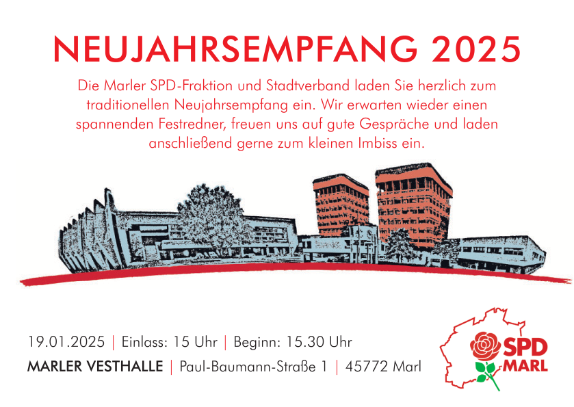 Die Marler SPD-Fraktion und der SPD-Stadtverband können in diesem Jahr Bärbel Bas, MdB, Präsidentin des Deutschen Bundestages, sowie Rolf Mützenich, MdB, Vorsitzender der SPD-Bundestagsfraktion, als Ehrengäste zum traditionellen Neujahrsempfang mit Ehrung Ehrenamtlicher begrüßen.